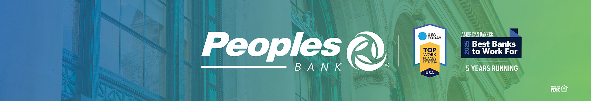 Peoples Bank has won a Top Workplace USA Award in 2022, 2023, 2024, 2025 and 2026! Peoples Bank also was named to the Best Banks to Work For list by American Banker in 2021, 2022, 2023, 2024, and 2025. Peoples Bank has also been recognized by Newsweek as a one of America's Greatest Workplaces 2024 and 2025.